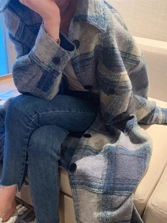 [EWQ]Plaid Single Tops Korean Outerwear Female Overcoat Fashion Spring Winter Women Loose Long Woolen Coats Kaschmir Mantel