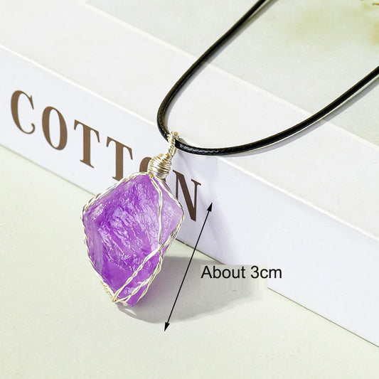 Amethyst raw stone wrapped silk pendant, handmade wrapped wire mesh bag necklace, sweater chain jewelry pendant