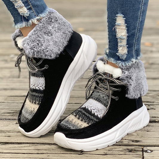 Fashion Black White Lace-up Sneakers Winter Warm All-match Plush Shoes Women Plus Velvet Fleece Flat High-top Sports Shoes